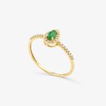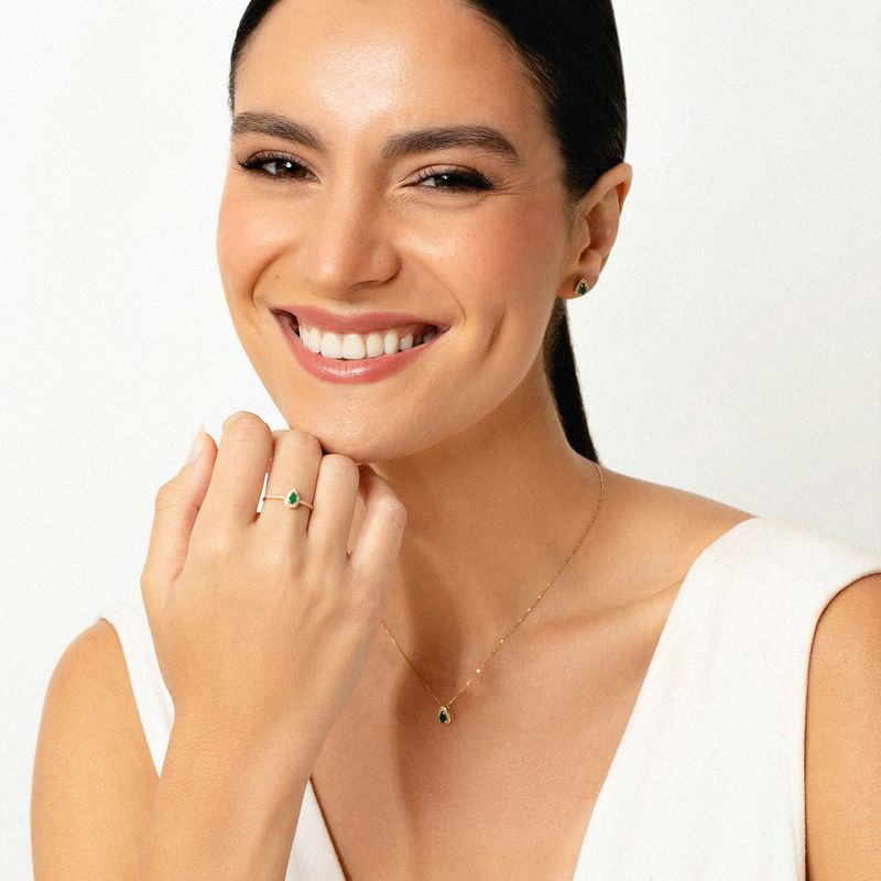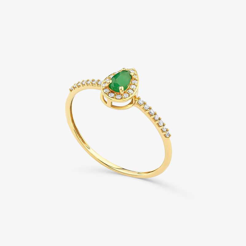 O destaque deste anel é a impressionante esmeralda em formato de gota, medindo 5x3mm, que confere um ar de realeza e sofisticação. A pedra é habilmente cravada com garras, garantindo segurança e realçando sua beleza natural. Além disso, o anel é adornado com um diamante de 0.005CT, que adiciona um brilho sutil e sofisticado ao conjunto.