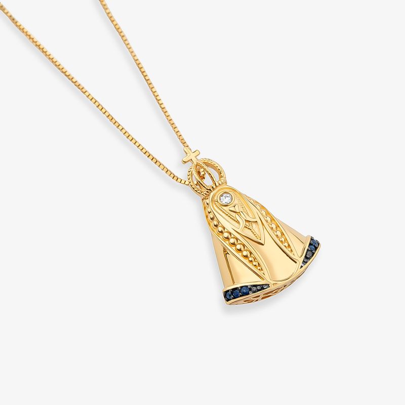 Este pingente Nossa Senhora Aparecida com Safira em Ouro Amarelo 18k faz parte da coleção Fé Nossa Senhora Aparecida, onde você encontra os mais diversos tipos de medalhas e pingentes em homenagem à padroeira do Brasil.