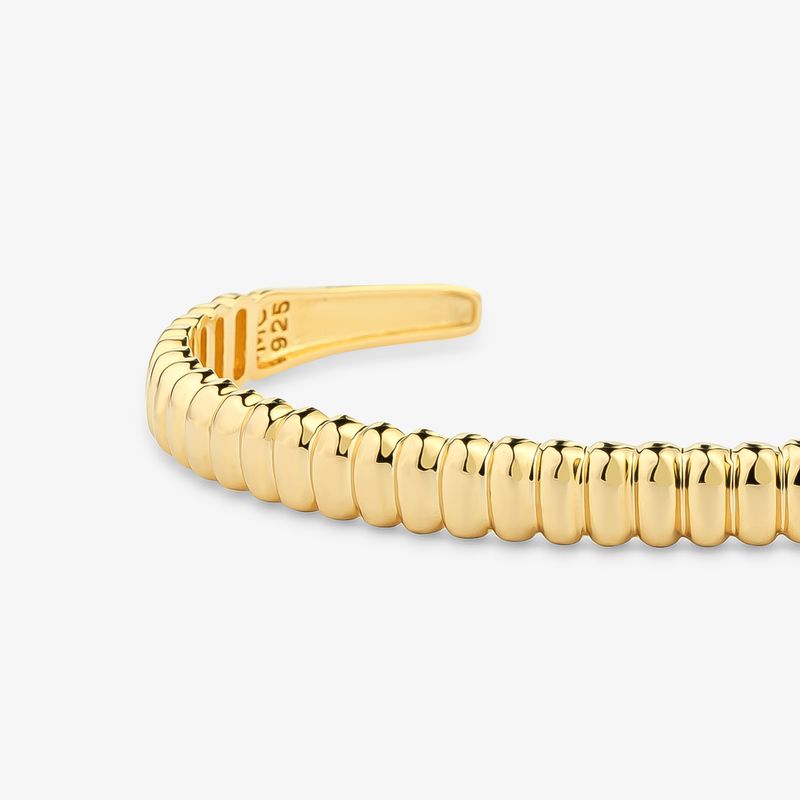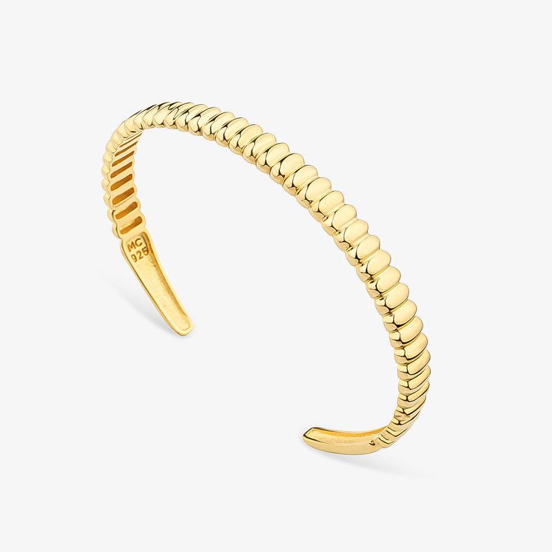 A Pulseira Textura em Prata traz o conceito das joias com texturas: com um acabamento polido, alto relevo em linhas verticais e brilho dinâmico que surge com cada movimento. Em prata 925 banhada a Ouro Amarelo 18k, a pulseira apresenta um padrão geométrico que funciona como um eixo de orientação entre elevadas proporções, trazendo a harmonia visual.