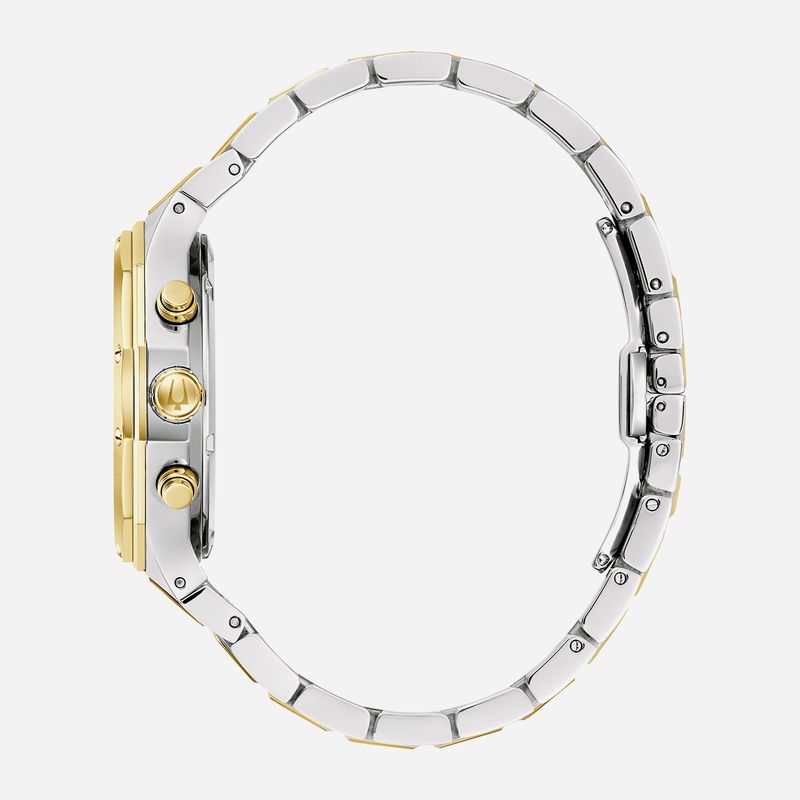 Com design moderno e marcante, este cronógrafo da linha Classic Bulova Prestige combina sofisticação e funcionalidade. Possui caixa de aço inoxidável de 40 mm em tom dourado e prateado, cristal de safira antirreflexo, resistência à água de 100 m e pulseira chanfrada de 3 elos com uma combinação de acabamentos escovados e polidos e um fecho de pressão desdobrável. O mostrador listrado branco-prateado tem ponteiros em tom dourado e marcadores aplicados com preenchimento luminescente Super-LumiNova, um mostrador de data e submostradores, incluindo um mostrador de 24 horas. Altamente funcional com um design distinto, este relógio é adequado para qualquer ocasião, do cotidiano ao extraordinário.