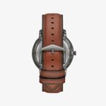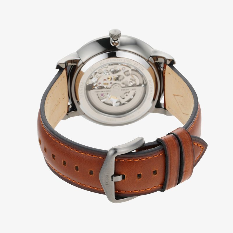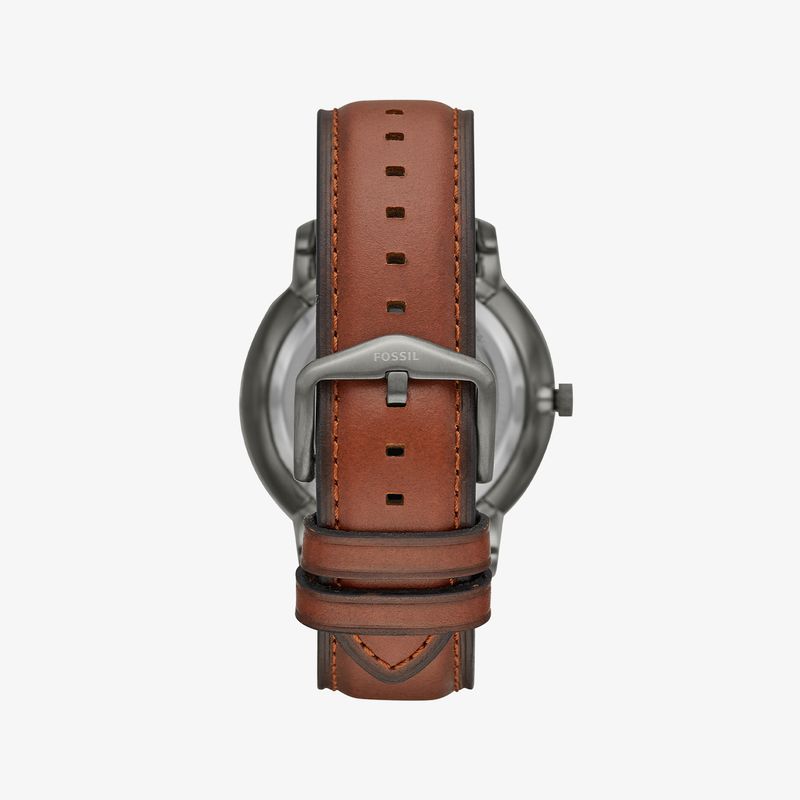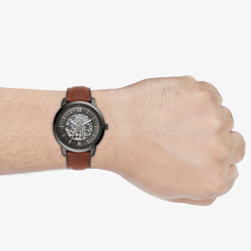 O Relógio Masculino Fossil da plataforma Neutra une design sofisticado e construção de alta qualidade. Sua caixa robusta envolve um mostrador cinza skeleton com efeito sunray, permitindo visualizar parte do movimento automático, um detalhe que valoriza a precisão e a tradição relojoeira.