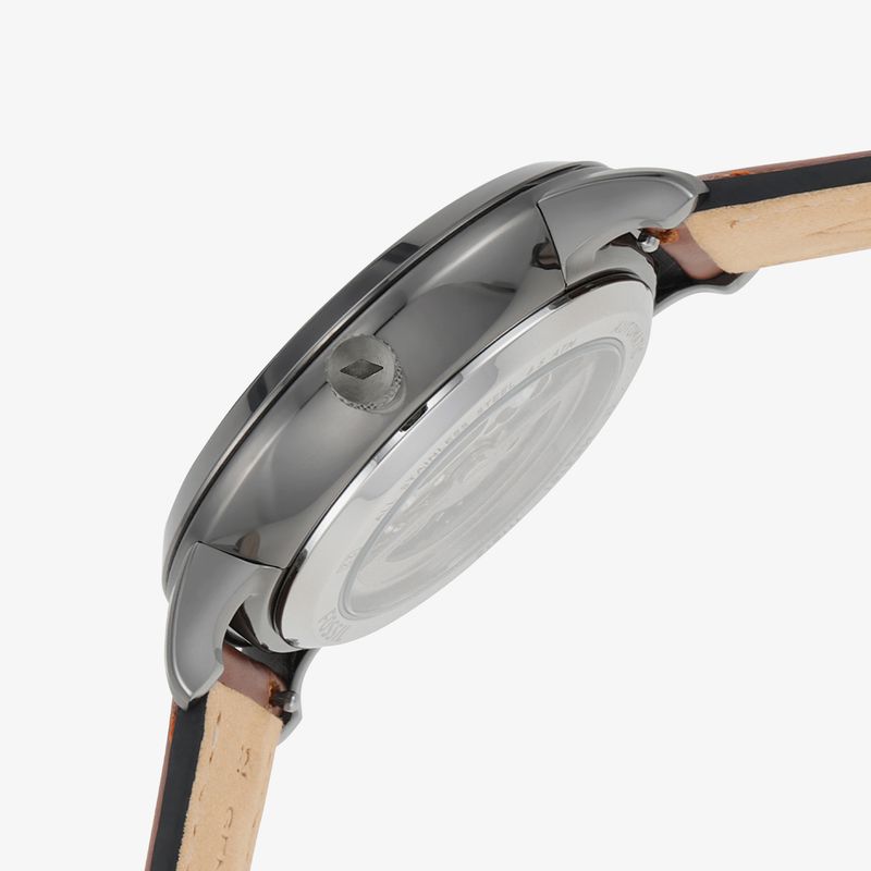 Os índices em bastão reforçam a leitura limpa e moderna, enquanto a pulseira em couro marrom adiciona elegância e versatilidade ao visual, criando um contraste marcante com o tom do mostrador.