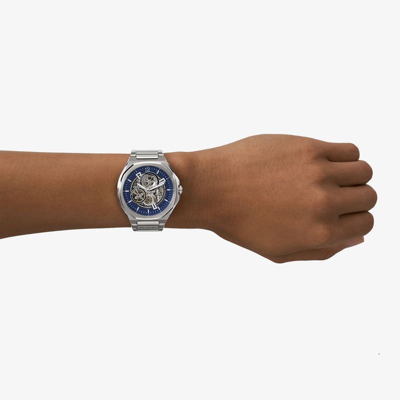 Combinando design clássico e materiais de alta qualidade, o modelo Evaston de 45 mm em aço inoxidável é a união perfeita entre estilo e precisão. O mostrador azul fosco proporciona um visual sofisticado, enquanto o movimento automático de três ponteiros garante desempenho contínuo e confiável.