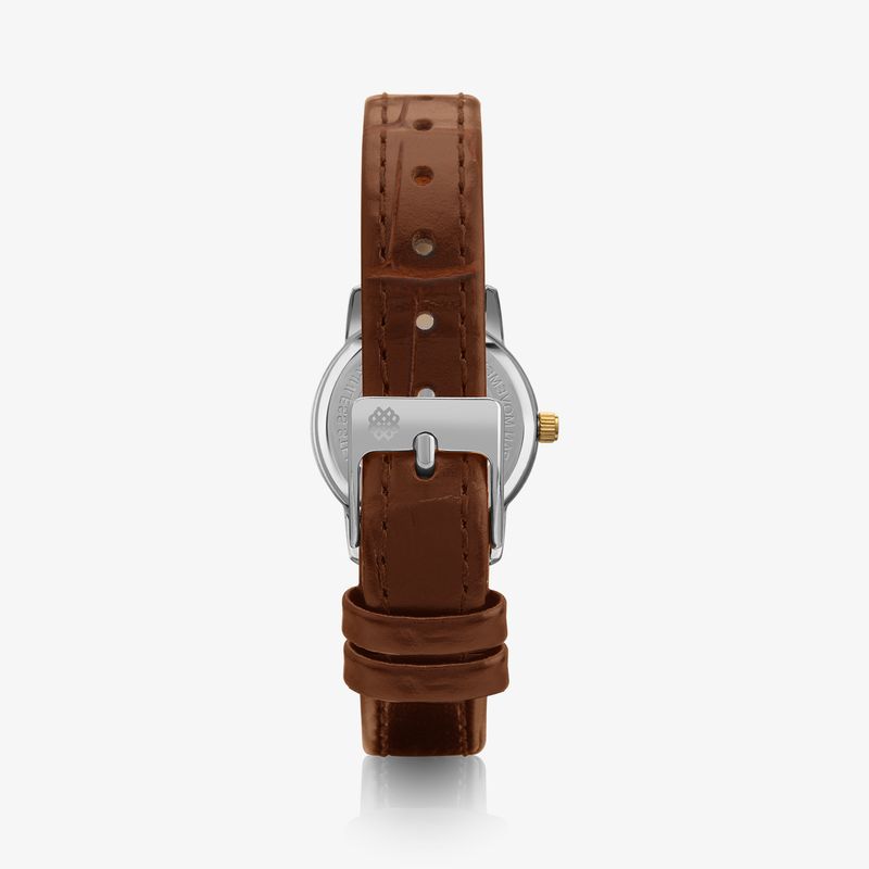 Este modelo em aço inoxidável bicolor conta com caixa de 32 milímetros e numeração completa no mostrador, que proporciona fácil e rápida leitura das horas, além de pulseira com 07 elos, trazendo delicadeza e sofisticação.